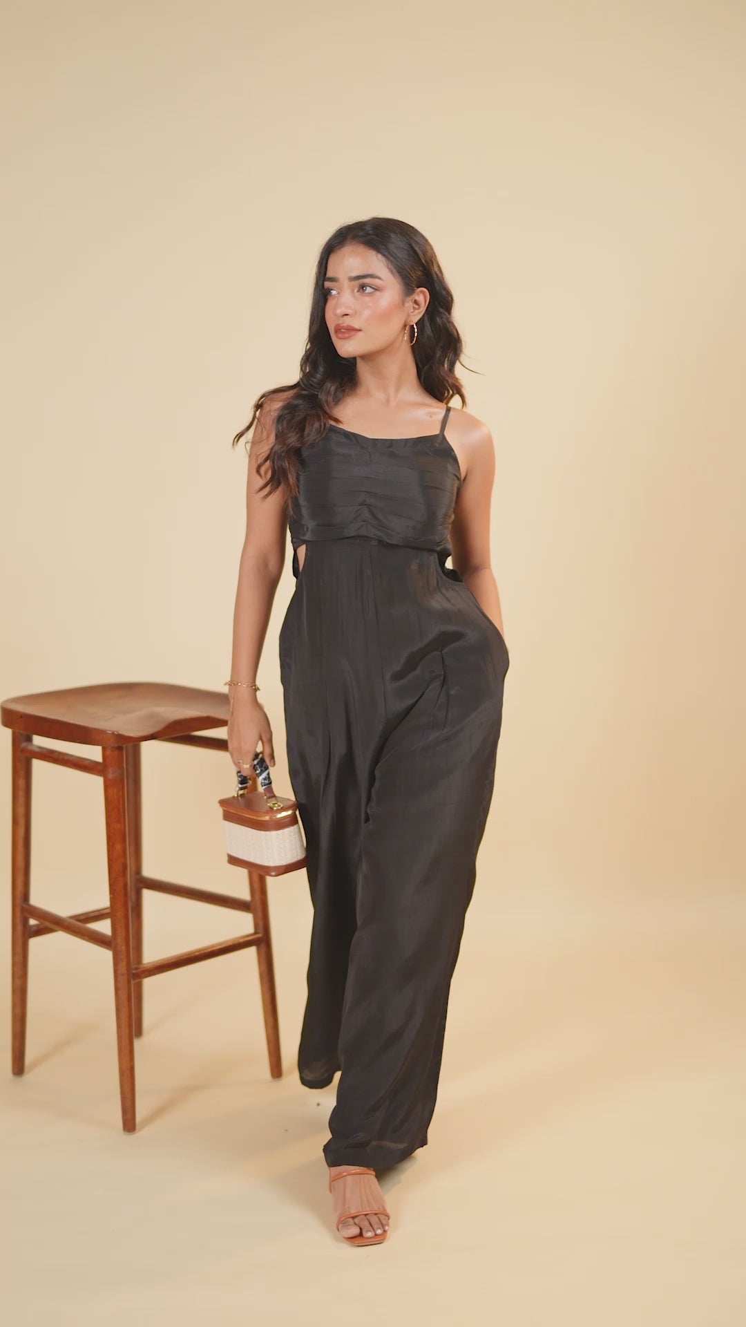 Black strappy Jumpsuit with front pleats on bust and front cut-outs on waist